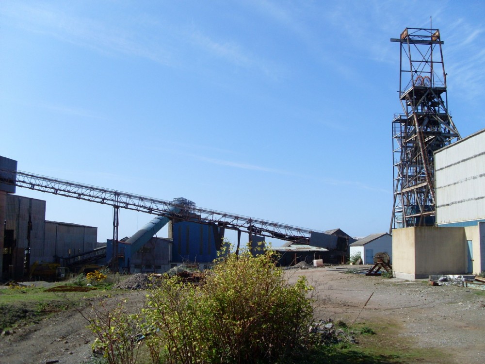 A general site view showing Cook's shaft headframe, the winder house and the conveyor to the mill in the background.