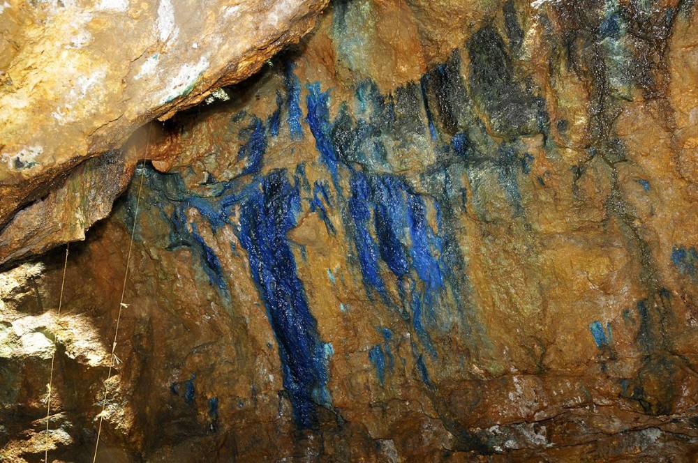 Copper staining (Azurite and Malachite) on the wall of the stope at the end of Magazine Adit or Powder Adit. [October 2012]