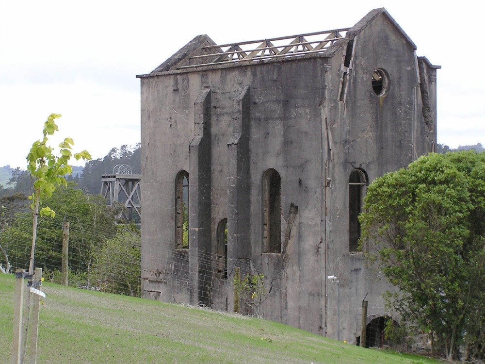 A view of the Martha Mine concrete pumphouse in its relocated position. The two gashes in the right hand wall mark where the shear legs from the headframe entered the building.