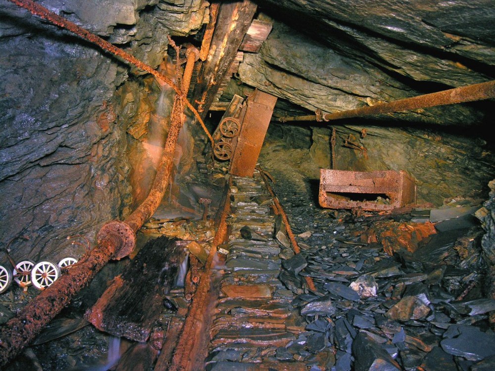 This waste truck sits wedged against the roof around B level on the incline. Above and to the left of it is a false floor which is now looking very dodgy; and under that the spray of water from a broken feed pipe which is charged by a reservoir dammed up in a flooded chamber.