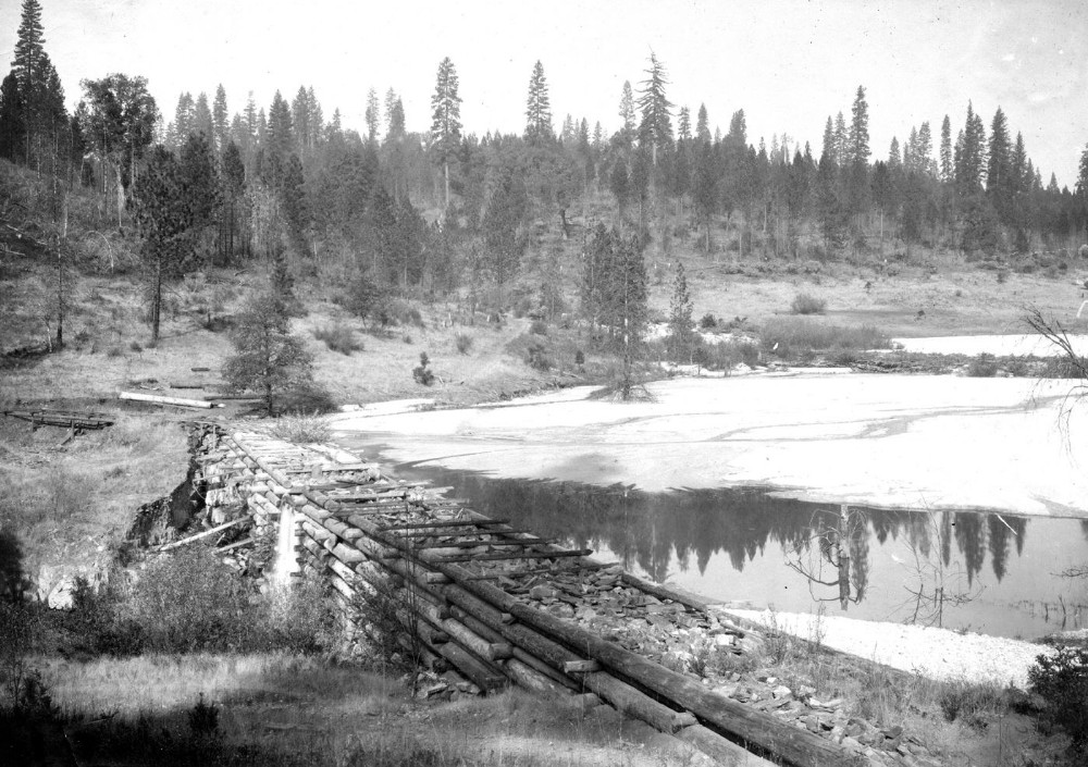 Crib dam on Spring Creek, built to restrain tailings from North Columbia hydraulic mines. Nevada County, California. 1905.