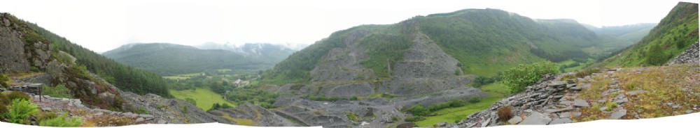 Panoramic view from Foel Grochan Level 5. Aberllefenni Mill and village visible to the left, Ceunant Ddu and Hen Gloddfa workings opposite.