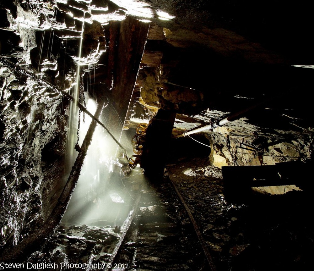 The now most recognisable of items in Cwmorthin the upturned slate truck jammed in the BV incline, lit from behind with a very powerful torch and using a long exposure to catch motion blur on the waterfal.