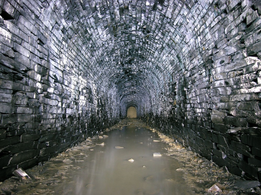 Looking from daylight down the Cwmorthin smoke flue adit.