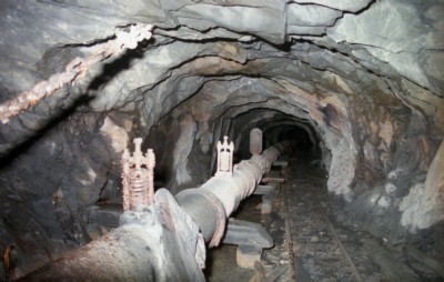 Two floors above G was the main DE floor level tunnel from the quarry to PenyBont. Variously referrred to as Lefal Galed, Lefel Coed and the Horse Tunnel, this dated back to the 1840's-50's. The turbine pipe to the G pump passed down one ancient shaft from the surface to the DE level, then bent through two right angles about 15-20 feet apart down the shaft to G floor. The latter shaft is in the foreground -note the massive timber baulk to stop the pipe moving under shock loads, in the background the pipe bends and rises again up the upper shaft.