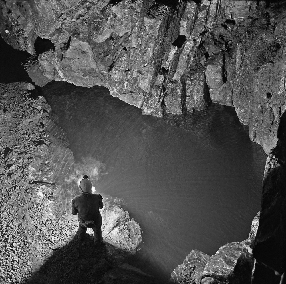 Copper deposits in the hill were mainly pipe type deposits and the steeply dipping lodes were followed down from (in this case) Salt's Level. This pipe now has a parallel footway next to it and the shot was taken from here looking down to the flooded pipe as it descends below the natural drainage (adit) level. A bit of an awe inspiring place, not to say a little disturbing, when someone throws a stone down one of the shafts from the hill top!