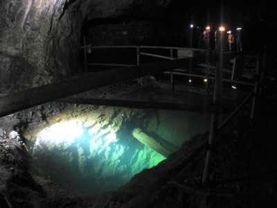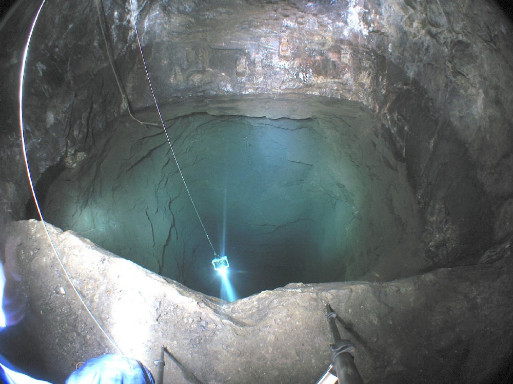 This shaft is located off the main shaft chamber. This very wide angle shot showing the video camera gear in the water and being lowered down.