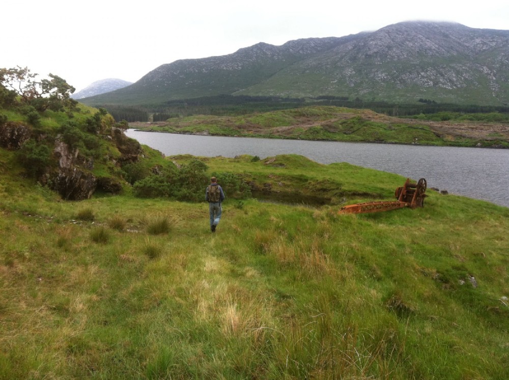 Looking down towards the Lough, crane visible in the distance, flooded pit to the left