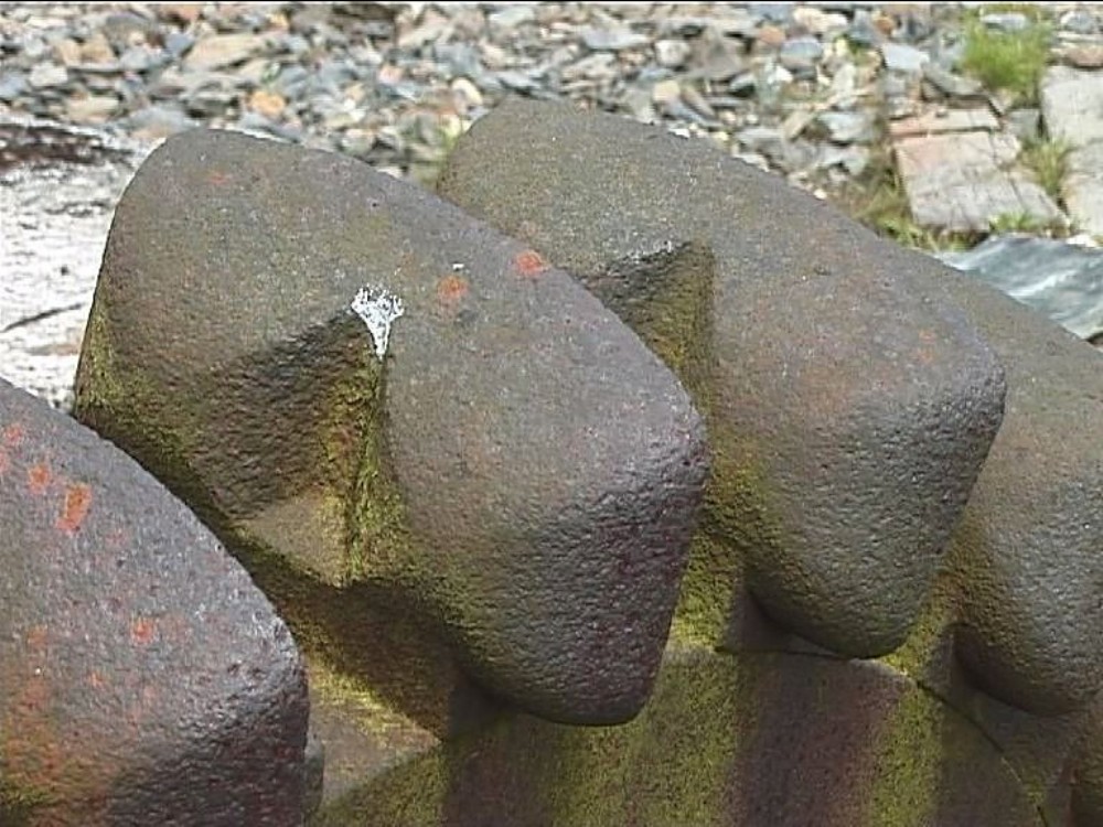 Detail of the pelton wheel, part of the remains of the c1900 water powered dressing floor equipment. [Grab from 12th July 2002 video]