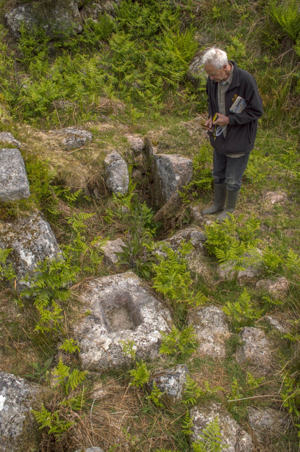 Internal context of the main features of the site. Note the hearth is free standing and would've probably been covered by clay save for the great heat. A granite trough sits in a sightly displaced position at the base of the hearth; this is described by Pryce (1778) and appears to be something of a "catch pan" for white tin that flows from the base of the smelter in liquid form. The mould stone is then in close proximity so as the tin might be conveniently ladeled from the trough to the mould.