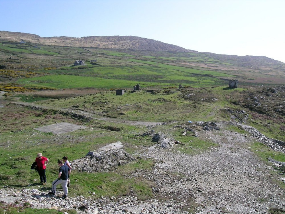 View across the site with capped shaft and remains of the dressing floor (foreground) and possible miners baracks or housing in middle background and powder magazine on right.