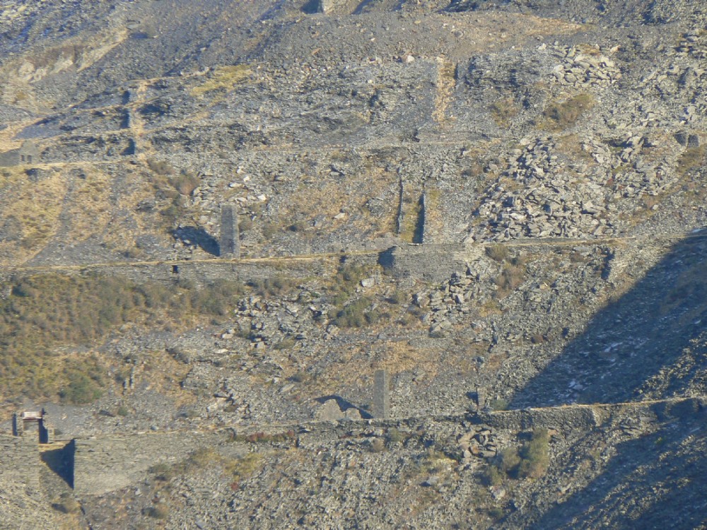 The two visible chimneys are for the Floor 0 (lower) and Floor 2 "Alabama" mills. To the right of the Alabama Mill chimney, just above the Floor 0 Mill chimney, you can see the beds of the old inclines to Floor 2 from floors 3 and 4.