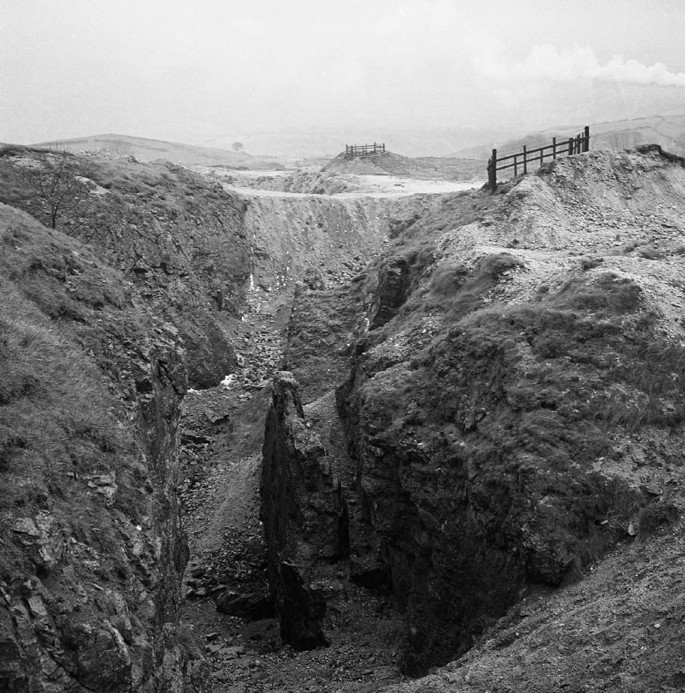 Since this photograph was taken, the area has been "sanitized" and the two fenced shafts shown are now covered by the ubiquitous grilles. Between the open cut and the road, the ground has been levelled and graded, with, it appears, some of this material having found its way into the open cut, thus reducing the depths somewhat