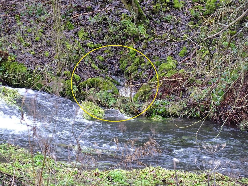 This is the only discharge around the area of the tail bolt for Nick Sough. It is slightly downstream of the weir. Discharge located at SK 20140 63920.