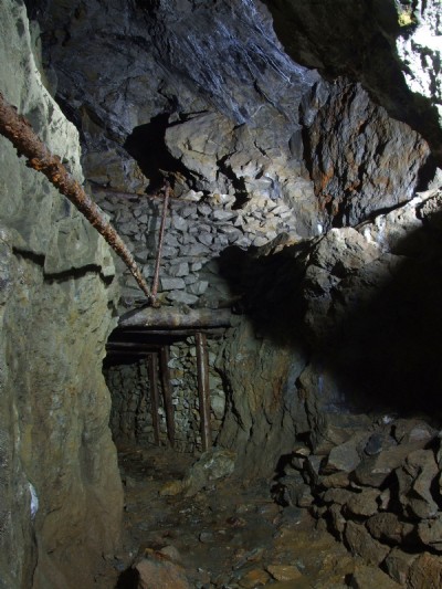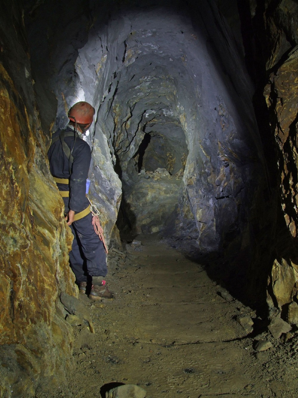 Taken near the forhead it can be seen that some re dialing had to be done to match with the pre-existing sole of the level. Note the high roof height, similar feature to the Frongoch adit and Glogfawr 112 fthm.