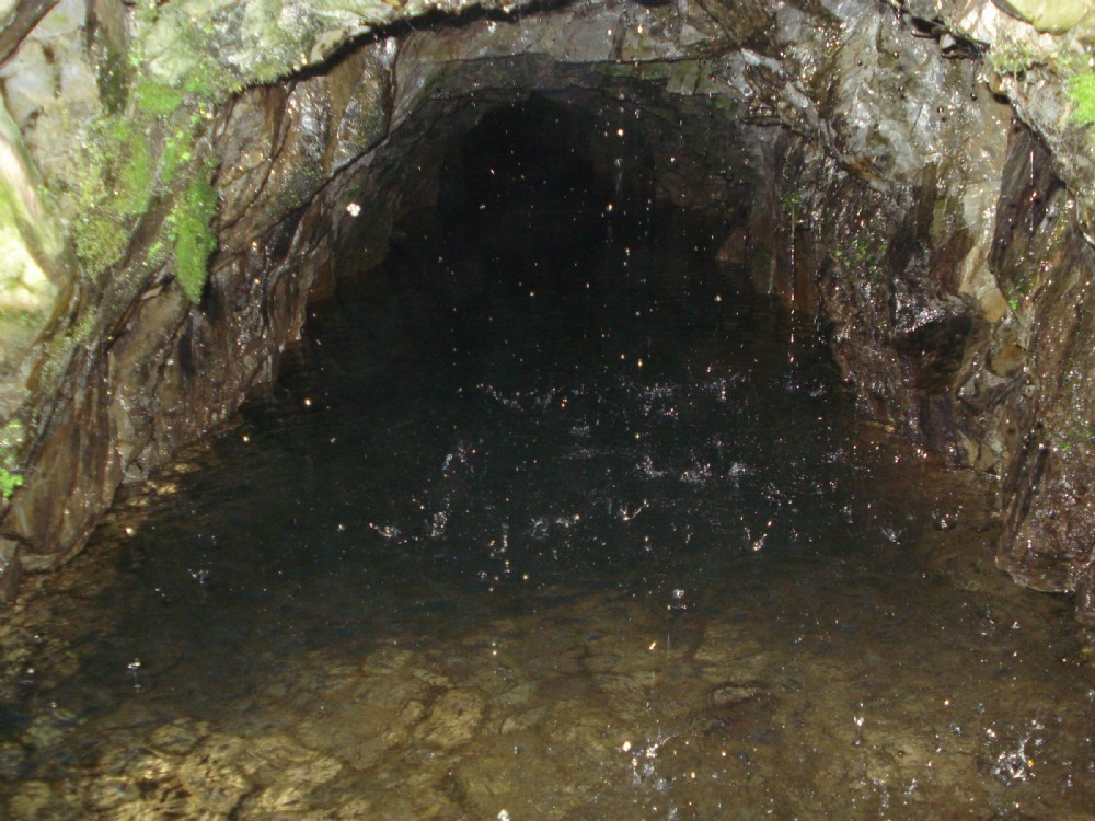 Inside the (very wet) entrance to the adit - appears to be heading towards the engine shaft down which a lot of water can be heard to be falling