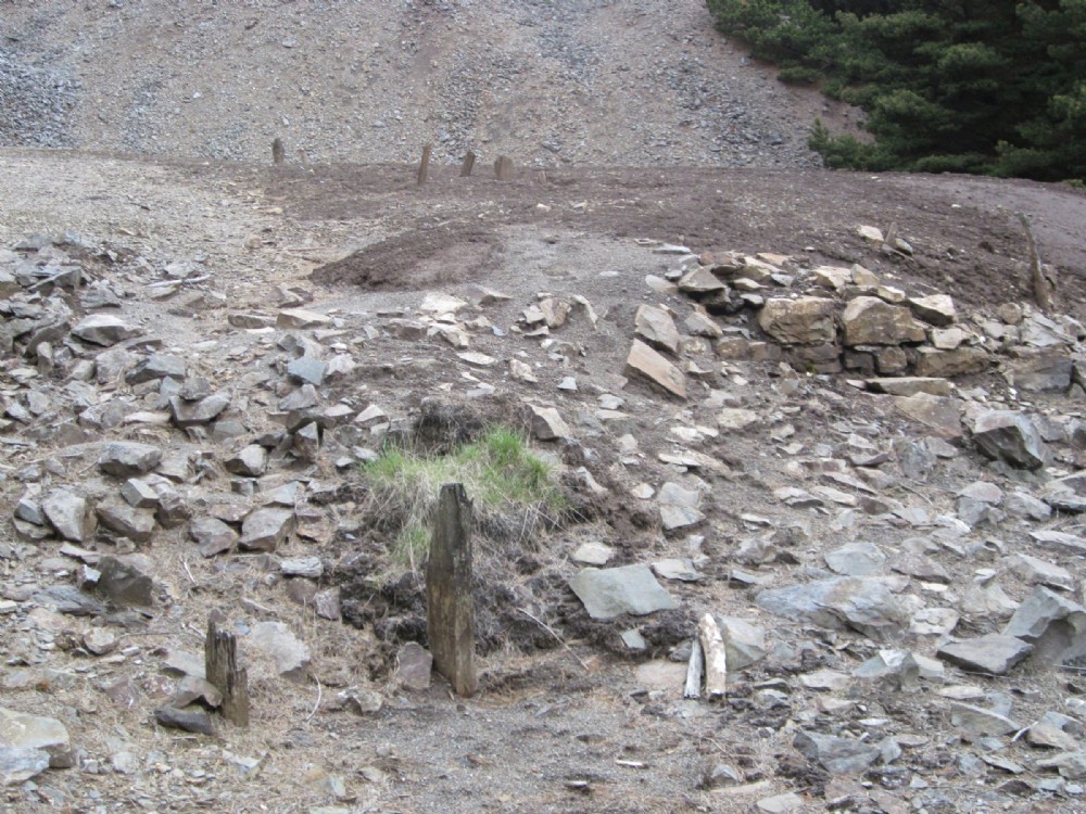 View north across the remains of the dressing floor towards the large waste heap on the far side of Nant y Cagl