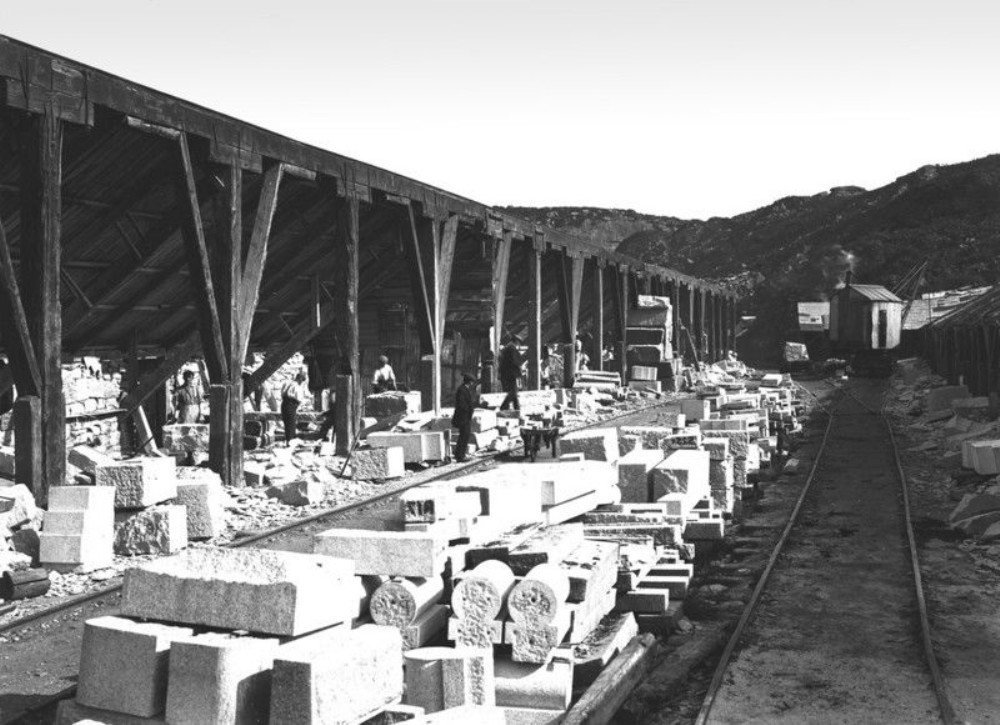 The De Lank quarries work the coarse-grained, grey granites of Bodmin Moor. The extensive range of granite products on display in the De Lank dressing sheds is a tribute to the skills of the masons who originally worked this hard intractable stone with only limited hand tools. Since the 15th century granite has been used in buildings as hewn blocks and cut into ashlar. Also, up to about 1800, granite was taken from the vast amounts of surface debris. More recently there was demand for building blocks of ground 'reconstituted' granite where planning regulations demanded the use of stone. The De Lank Quarries near Bodmin produced a light grey granite. Large blocks were obtained from the quarries because of the regular jointing. The Eddystone, Beachy Head and Small Rock lighthouses are among many buildings constructed from De Lank granite.