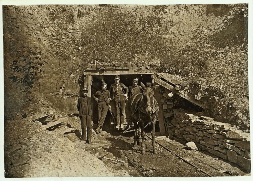 Drift Mouth, San Lick Mine, near Grafton, W. Va. Bank Boss in centre: driver on his right: trapper boy outside. Alfred, about 14. He trapped several years during vacation: said he is going to school this year: asked if it were because school is more fun he said. "This yere hain't no fun!".
