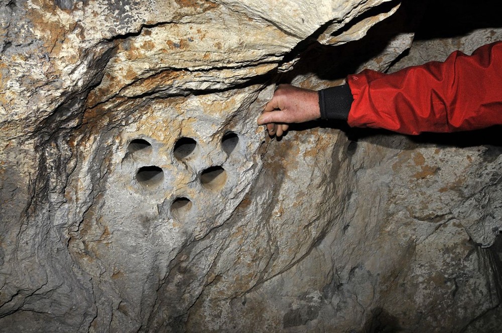 Drill holes in the South wall of the Man Engine chamber (South East & West Lode), Main Adit. [October 2012]