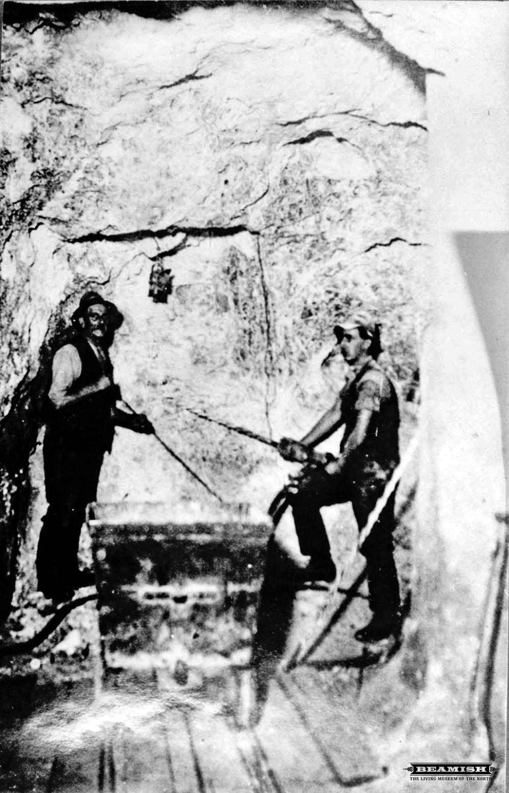 Tom Cawkwell (left) and son Harold drilling in fore end, Settlingstones Mine.