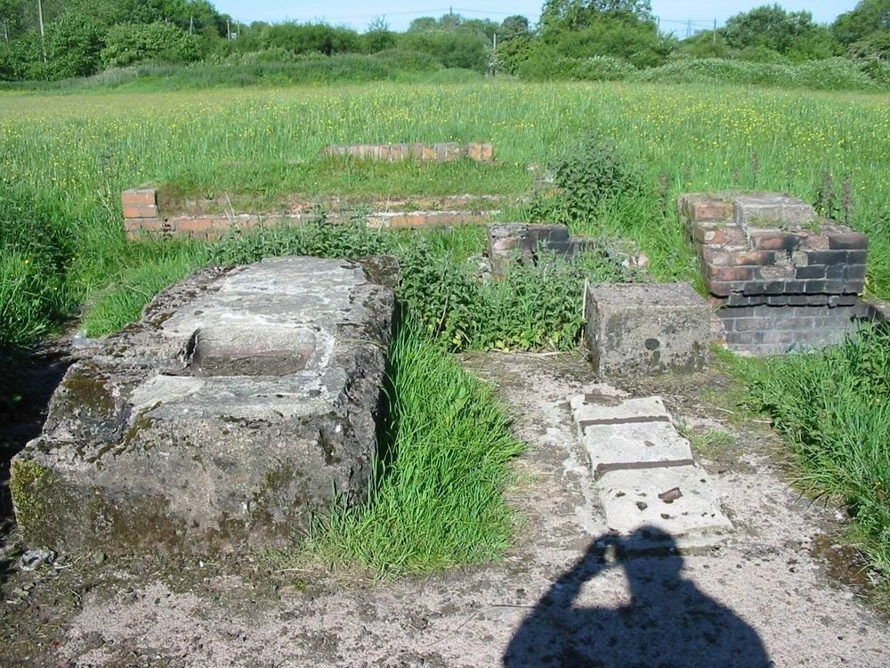 Big bolts, guessing motor pulley outrigger bearing pedestal. Suspect square brick building was grid sub-station.