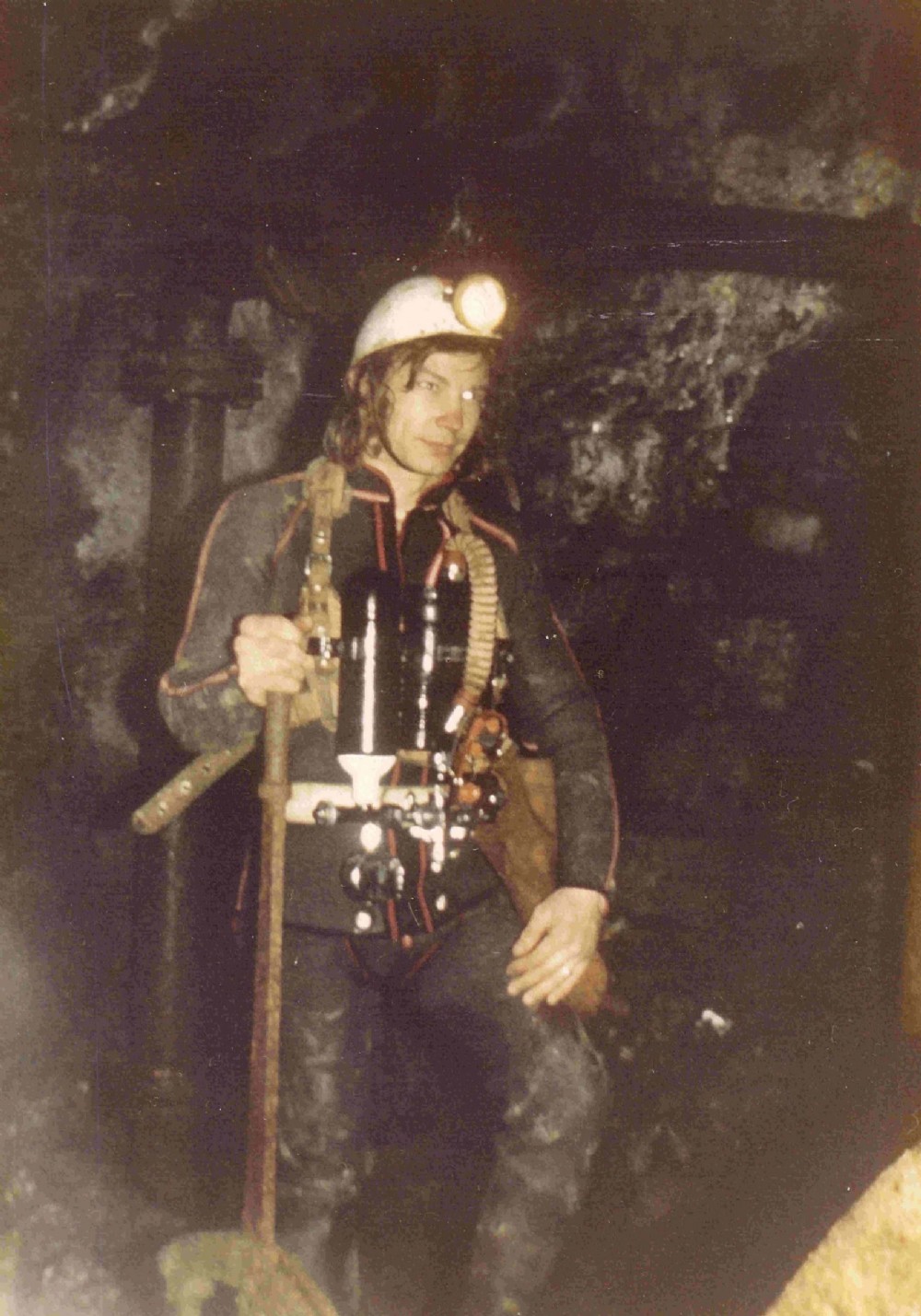A young Ian Cornwall stood in the driving position of the Sir Francis winder, hand on the forward/reverse lever, foot on the brake. Note the oxygen rebreather, giving 30 minutes of life!! Not enough to reach the entrance, but fortunatly not needed on this trip
