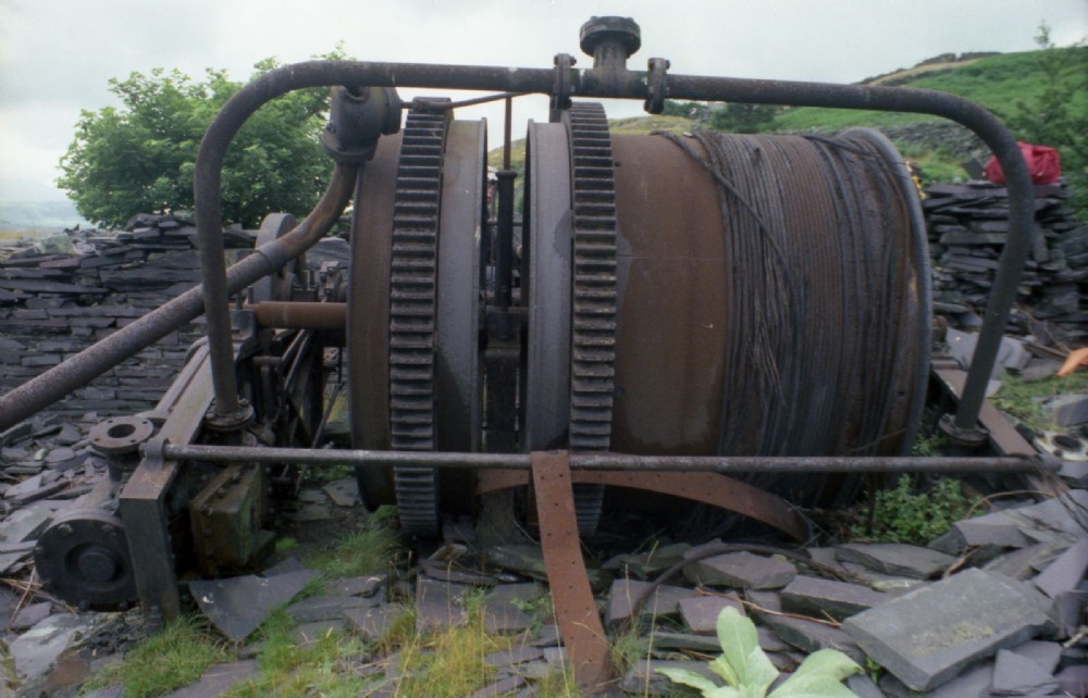 On the left is the traversing rope drum, on the right the hoisting rope drum. The brake bands lie twisted in front.