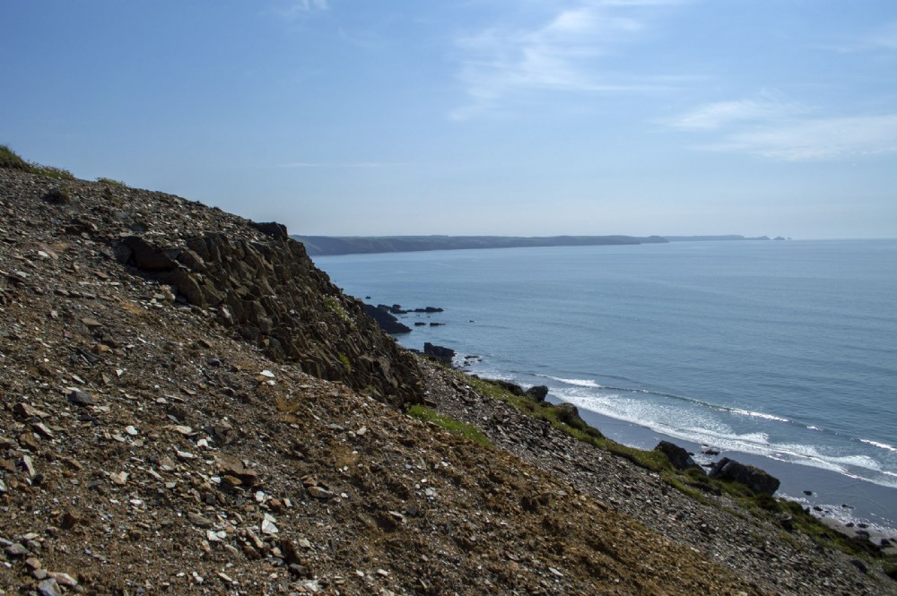 Wall reveting spoil heap in a level platform. Smelting slag is present in the debris.
