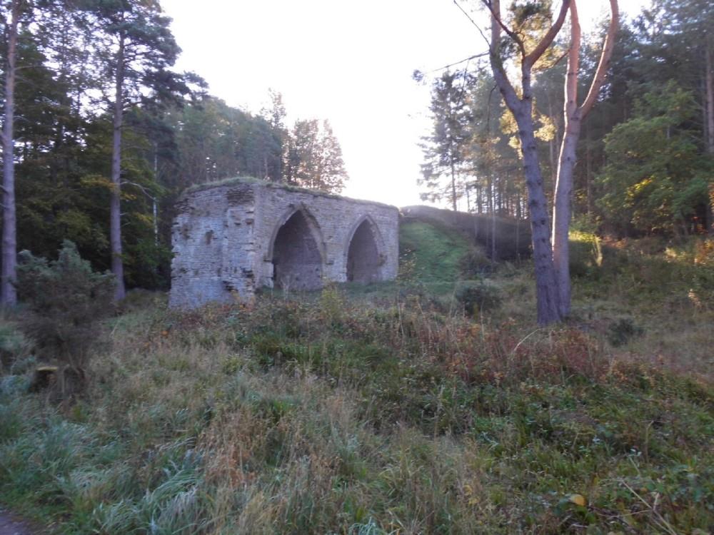 The substantial remains of the arches, western face, carrying the flue to the chimneys (on the right), otherwise there is not that much left of the smeltmill. The site has been extensively researched, see below.