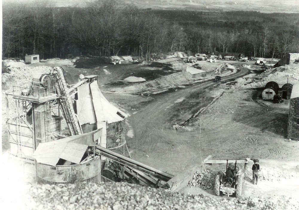 Duncton Chalk Quarry c.1951. The primary crusher in the foreground, the engine house on the extreme left and the kiln loading area in the centre.