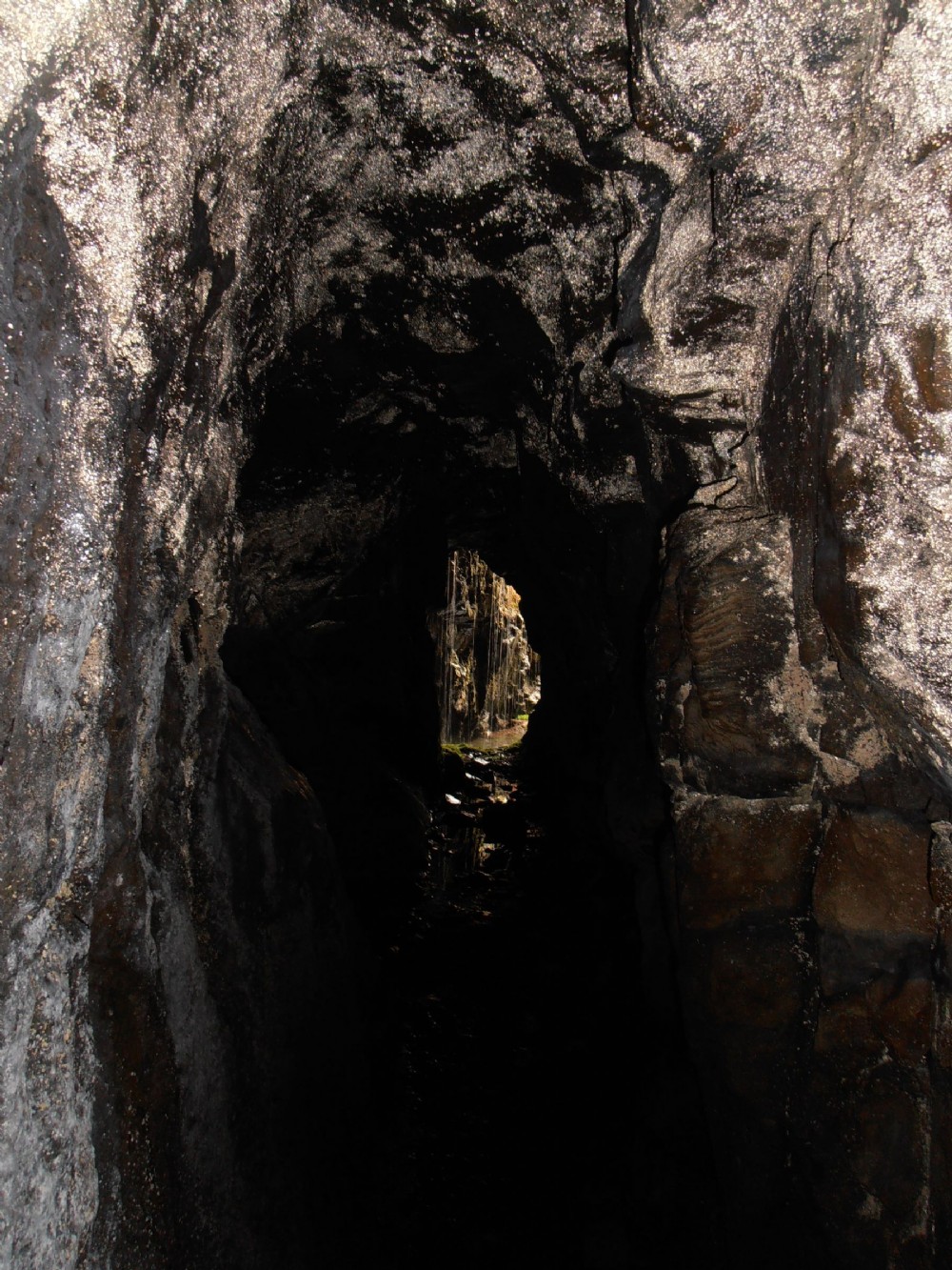 Cyfartha Roman adit. Once inside a more recent level branches off to a winze whilst the main coffin-level continues forwards towards the Esgairgaled lode.