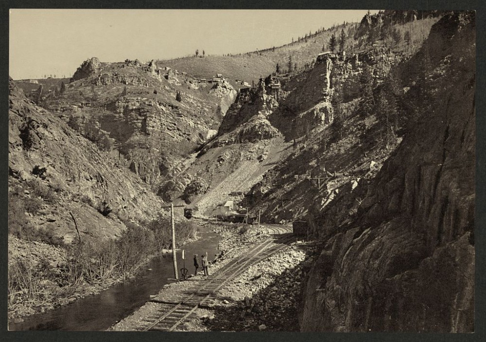 The railway passing through the Canyon. Some of the gold and silver mines of the Canyon can be seen.