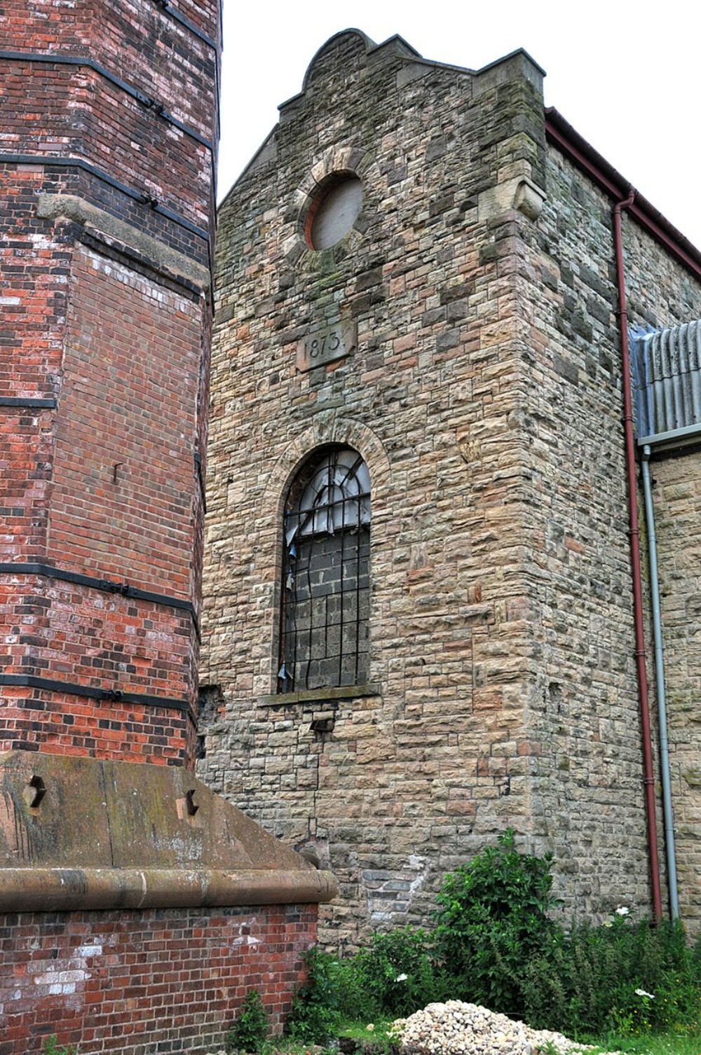 South engine house East wing gable, with 1873 datestone. The red brick chimney (left) is the surviving one of two.
