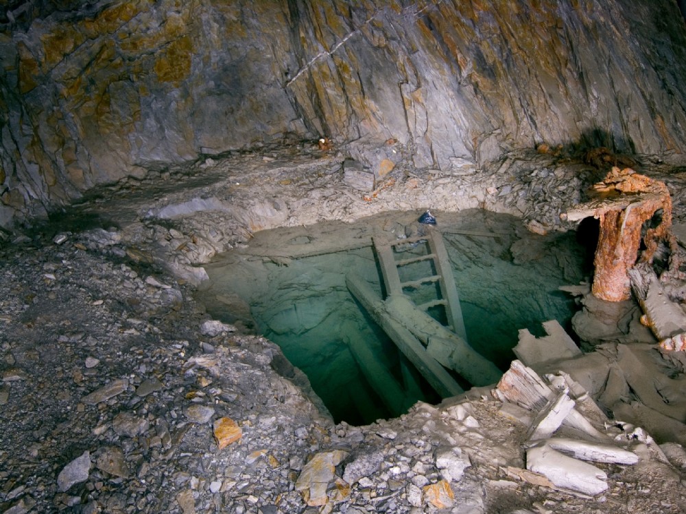 View down the flooded eastern engine winze at Alltycrib / Talybont mine. Ladderway clearly visible.