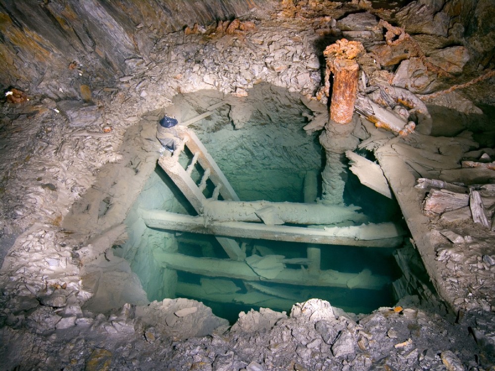 View down the flooded eastern engine winze at Alltycrib / Talybont mine. Ladderway clearly visible.