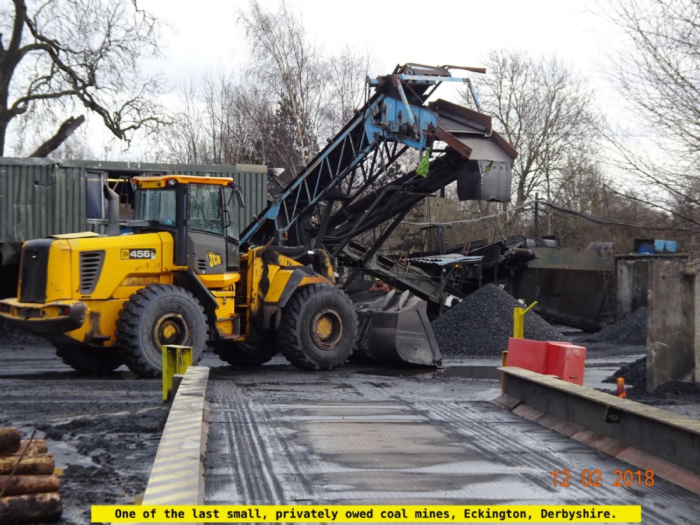 Photo taken 12/02/2018. Coal being delivered to the surface from a conveyor just behind the red box. It forms a heap which is carted off to be stored by a tractor unit with a bucket.
