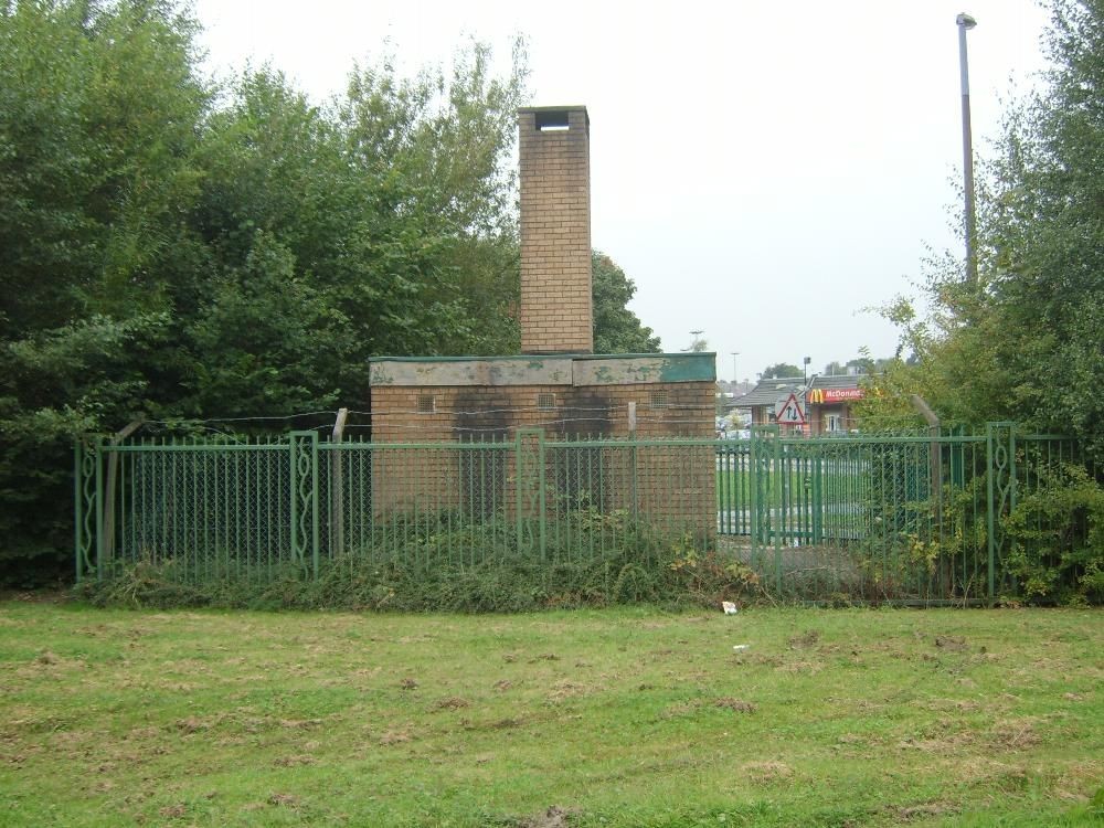 View looking toward Walkden shopping centre , showing the chimney stack which allows the burn off of excess methane gas.