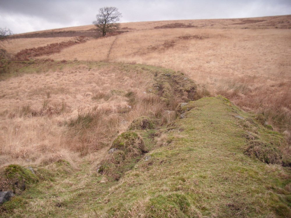 The line of the tramroad is very clear where it crosses rough land and a small stream north of Henrhyd.