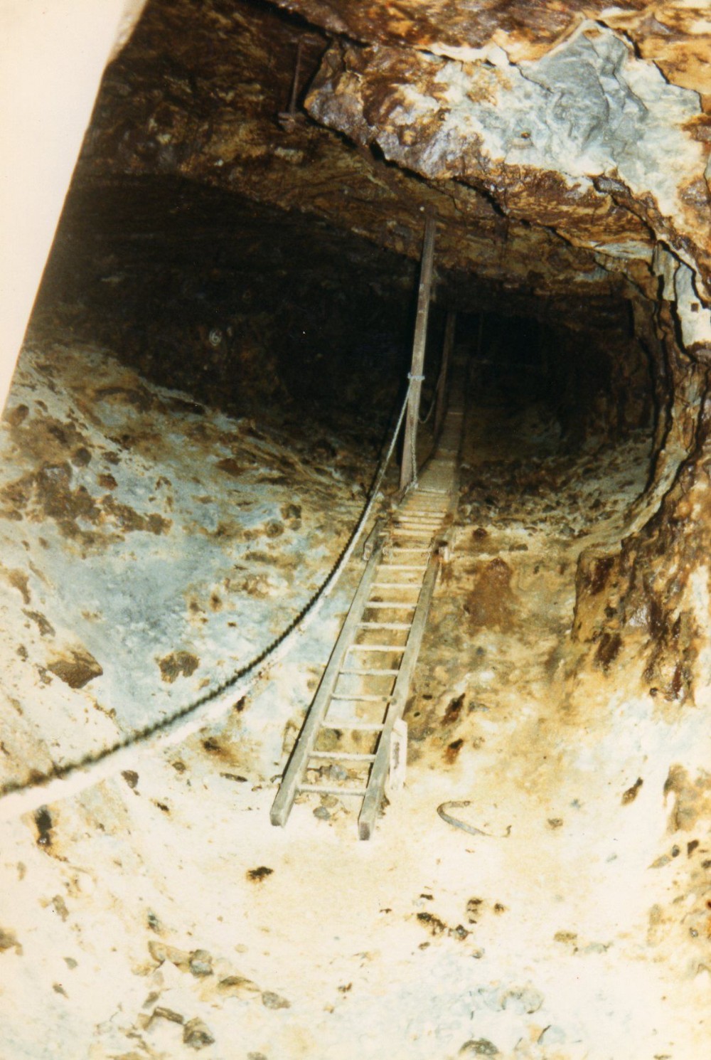 The ladder in this shot sits at about 40 degrees. at the top there is a short climb up Robinson's Shaft to adit. 1988