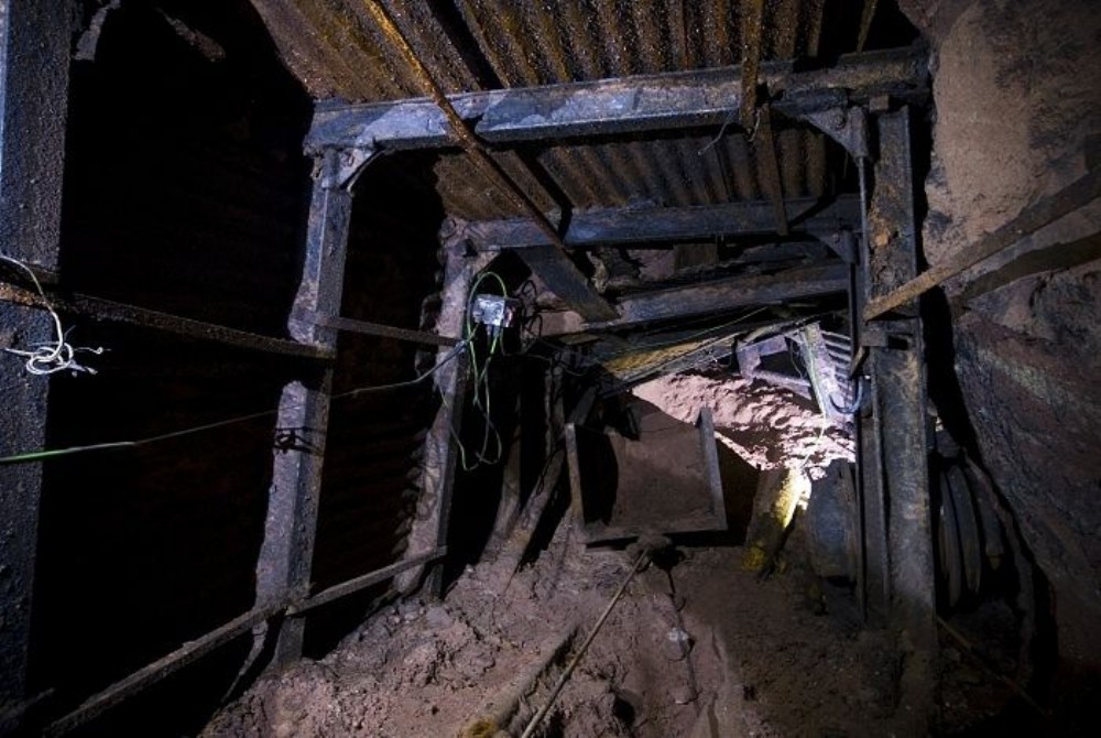 Tub on cable to the left, electric winder to the right. The cable looped around a pulley at the top, where it still seems to be possible to exit the colliery.