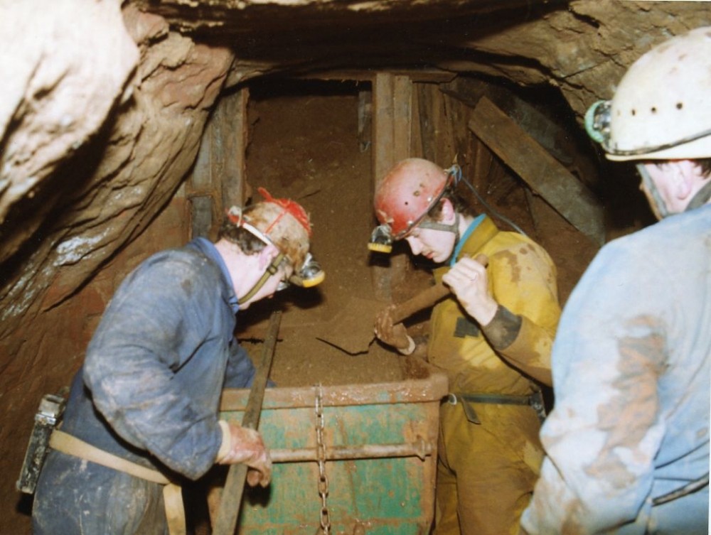 DCC members emptying the Bear pit ore chute, one has stopped to check out a find in the spoil, circa 1987