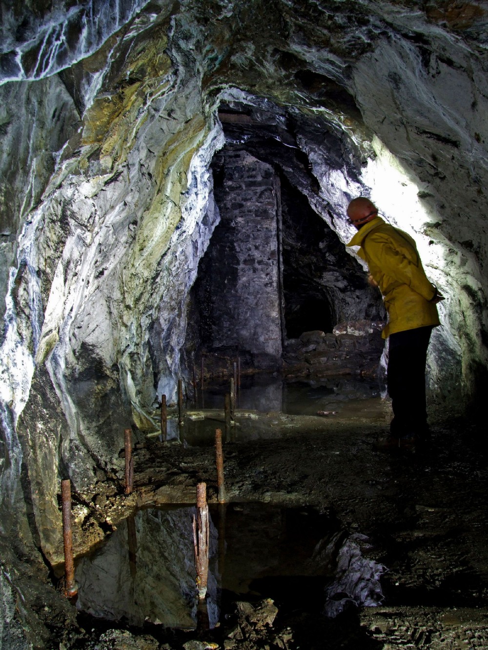 At the back of the engine chamber is an engine bed, probably for a steam engine used for pumping and winding. The now flooded depression very likely for a balance bob.