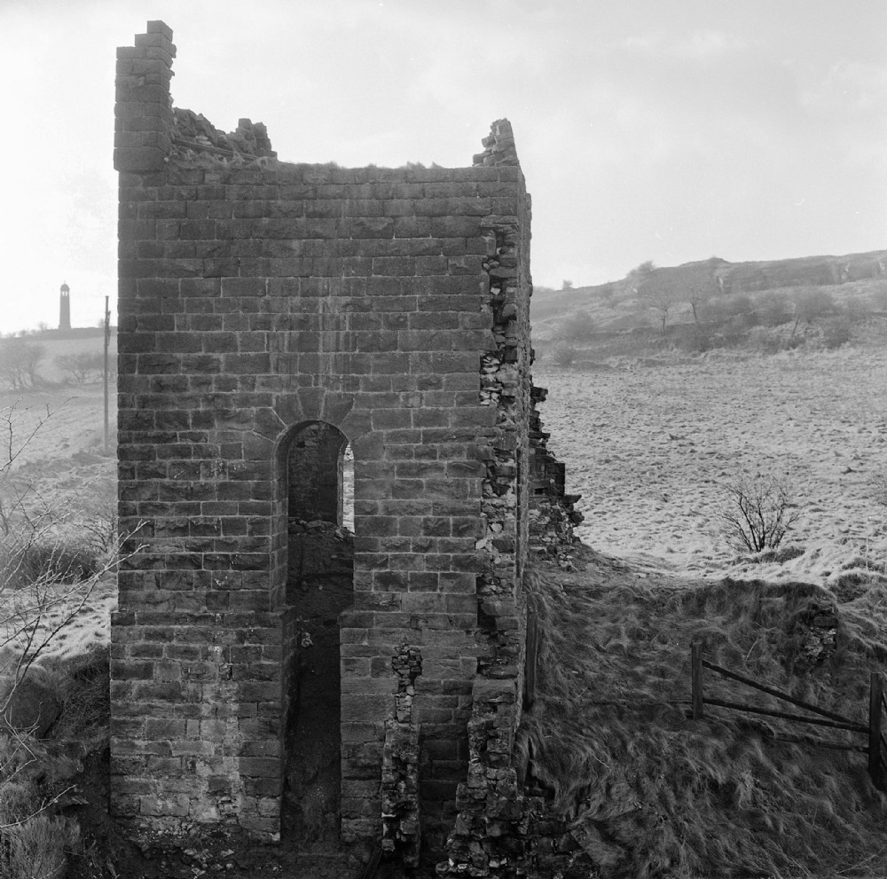 View of engine house across the cratered shaft, taken 1968. Today, nothing remains here, the engine house having been demolished and most of it thrown down the shaft.