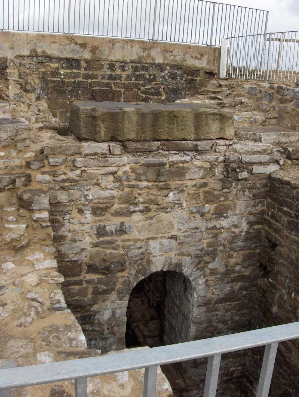 The engine house bob wall, with an arch going through into the condenser pit. The large block is a bob counterbalance weight which the conservation team forgot to move before they emptied the engine pit...