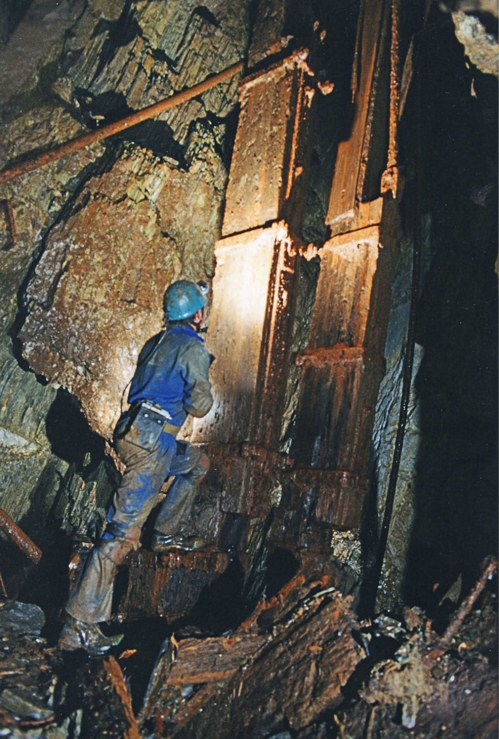 In the Frogoch engine shaft there are several pump rods. It appears that these must have failed regularly and been replaced by new ones, the old just moved to one side. One has been lashed up as a rudimentary form of repair.