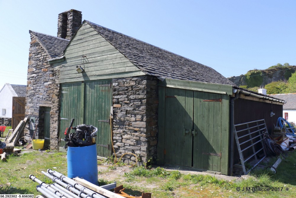 There was a tramway at the Easdale slate quarries and there were said to be a number of locomotives to pull to the wagons. This shed has rails running into both sets of doors on the 2nd Edition OS Map but the track does not go to the building on the 1st Edition OS Map - could it have been a stable then (that could fit with the doorway in the roof as often used for loading animal feed?).