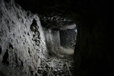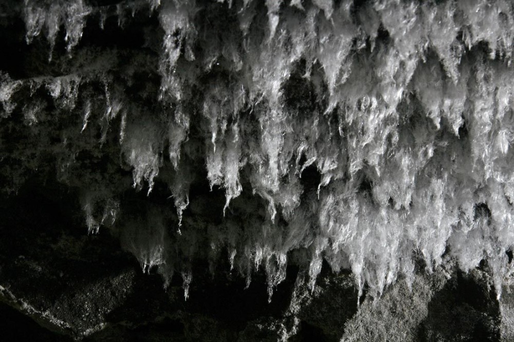 Fragile, hair-like crystals of magnesium sulphate (epsom salts) growing from the roof in the flats.