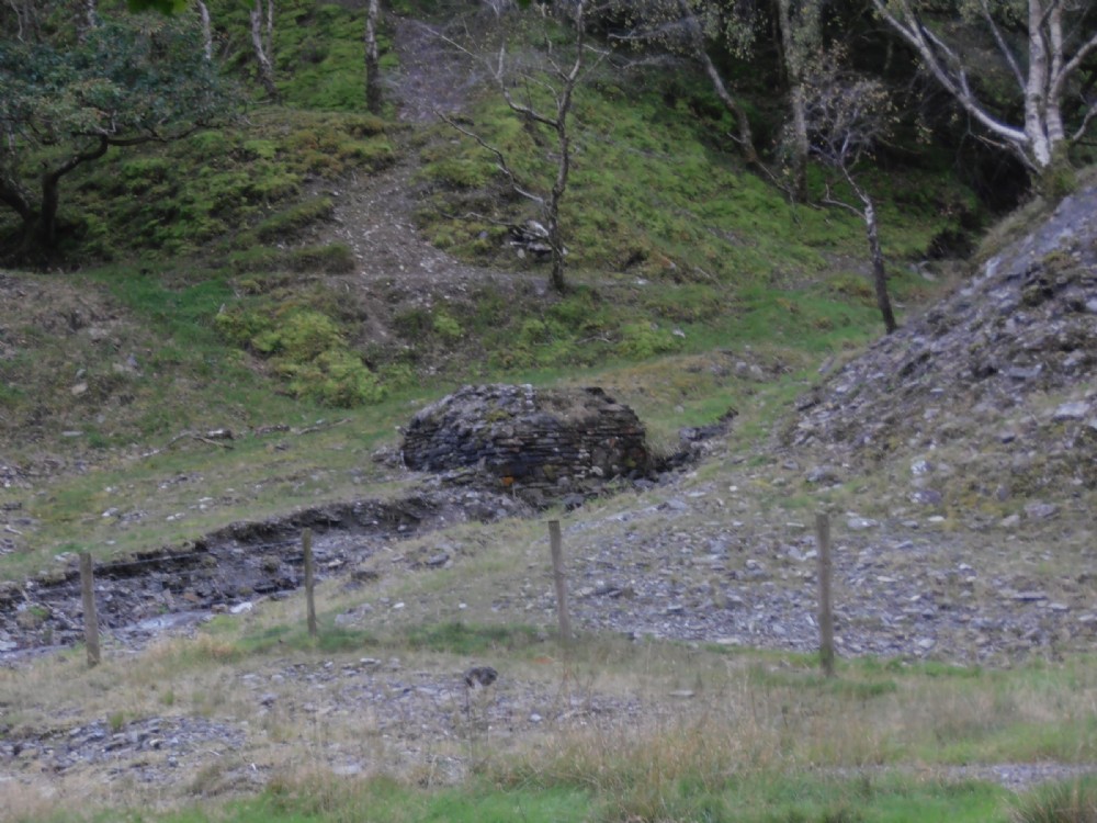A closer look at the possible pillar. Past it flows Nant Rhugos that created the ravine above.
