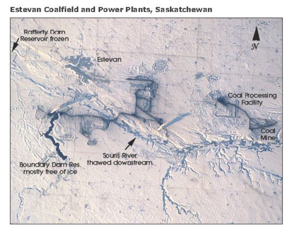 Areas of active surface mining and processing appear black in the photograph; roads used for transporting the coal are also dusted black. Around the areas of the mines, a rough texture reveals other spoil piles and areas where underground mining used to take place.